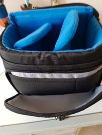 valigetta morbida nera marca HAMA comoda da viaggio- all'interno due separatori morbidi che si possono spostare perchè muniti di velcro- tasca anteriore e taschini laterali - nei due passanti posteriori può passare una cinghia da legare in vita- non ho più la tracolla