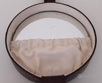 la borsa è di forma rotonda e misura cm 14,00 di diametro x cm 6,00 di altezza