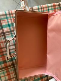 Valigetta da viaggio vintage vintage con asta telescopica in oro rosa telaio in alluminio avvolgente, bella e buona tenuta, buon supporto. Lo strato intermedio ha uno scomparto a rete e due tasche aggiuntive per una maggiore panoramica e ordine. Il suo design chic e alla moda lo rende la scelta perfetta per i viaggi.