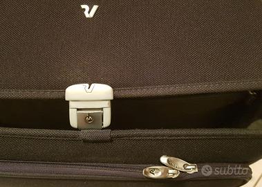 Vendo valigetta ufficio Roncato colore blu, originale, vintage, introvabile. Struttura rigida e a soffietto per espandersi e ospitare documenti e PC, tasca con cerniera anteriore e posteriore, dotata di chiusura a chiave inclusa, scomparti porta penne, biglietti visita, tasche, scomparti richiudibili per piccoli oggetti, completa di tracolla staccabile con moschettoni, maniglia basculante per una presa confortevole e banda posteriore per aggancio a trolley per trasporto in viaggio. Il tutto in ottimo stato conservativo presenta qualche segno di usura esterni vicino al gancio tracolla causato dal normale uso, interni perfetti. Colore come da foto. Misure 42 x 33 x 15 cm. Per altri dettagli vedi foto. No spedizione