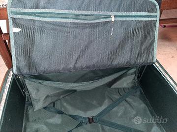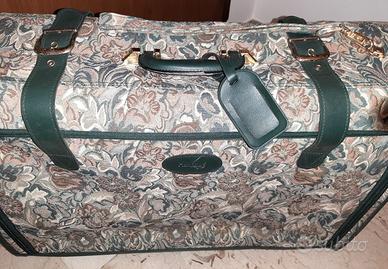 Elegante valigia di provenienza U.S.A., fine Anni '90/inizio 2000, usata un paio di volte e in condizioni pari al nuovo, in robusto tessuto fiorato a tonalità verdi con finiture dorate. Chiusura con cerniera lampo, rinforzata da due larghe cinghie. Solido cintino laterale per traino, nel medesimo tessuto, applicabile alla parte superiore con moschettone dorato. Interno verde scuro con cinghie elastiche, un tascone traforato e una tasca portaoggetti, entrambi con chiusure a cerniera. In perfetto stato di conservazione, è priva di qualsiasi difetto comprese le cerniere lampo, le rotelle e tutte le cuciture. Dimensioni in cm. (escluse rotelle): altezza 46, larghezza 68, profondità 22. Visibile a TORINO Porta Susa e, occasionalmente, anche ad ASTI o lungo tutto il percorso Torino-Asti della S.S. 10. Per eventuale SPEDIZIONE scrivetemi e valuteremo la soluzione più vantaggiosa.