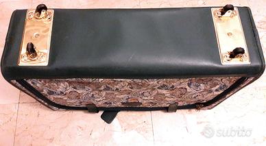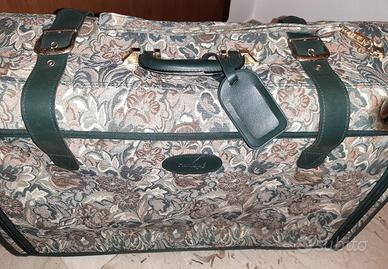 Elegante valigia di provenienza U.S.A., fine Anni '90/inizio 2000, usata un paio di volte e in condizioni pari al nuovo, in robusto tessuto fiorato a tonalità verdi con finiture dorate. Chiusura con cerniera lampo, rinforzata da due larghe cinghie. Solido cintino laterale per traino, nel medesimo tessuto, applicabile alla parte superiore con moschettone dorato. Interno verde scuro con cinghie elastiche, un tascone traforato e una tasca portaoggetti, entrambi con chiusure a cerniera. In stato di conservazione perfetto, è priva di qualsiasi difetto comprese le cerniere lampo, le rotelle e tutte le cuciture. Dimensioni in cm (escluse le rotelle): altezza 46, larghezza 68, profondità 22. Visibile a TORINO Porta Susa e, occasionalmente, anche ad ASTI o lungo tutto il percorso Torino-Asti della S.S. 10.