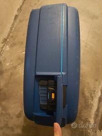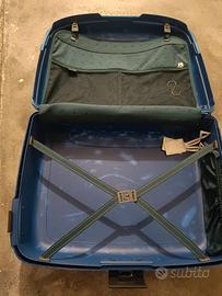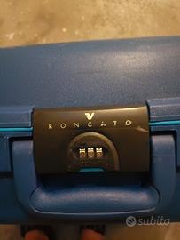 valigia azzurra marca Roncato con chiusura codice e rotelle per trascinato