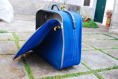 valigia in tela blu della DELSEY dotata di manico estraibile e rotelle posteriori, molto capiente dimensioni 70 x 58 h.20