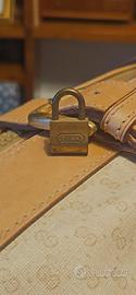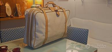 Valigia Gucci semirigida motivo a monogramma (GG), bordi in pelle chiara, manici in cuoio e serratura metallica, con lucchetto originale. Dimensioni 67 x 44 x 17. ottime condizioni
