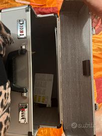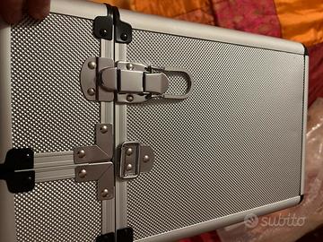 La valigetta da pilota è realizzata in alluminio e dispone di una tracolla rimovibile e due lucchetti a combinazione. Inoltre, la valigetta offre chiusure laterali a scatto e una maniglia resistente. All'interno si trovano su scomparti. La valigetta da pilota in colore argento ha le dimensioni esterne circa 36 x 46 x 20 cm. La valigetta ha un peso a vuoto di circa 3,25 kg. Appositamente progettata per diverse situazioni di applicazione, ogni viaggiatore e ogni business trova la sua valigetta ottimale in alluminio. valigia da viaggio, business, industriale, su misura, per foto, pilota, laptop, trolley, valigetta.