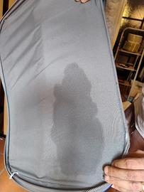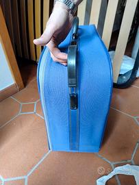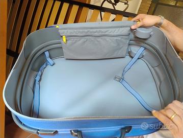 Semirigida in tela con maniglione x il trasporto e ruote. Colore bluette. Misura 66 lar x 56 h x 21 prof. All'interno c'è una macchia.