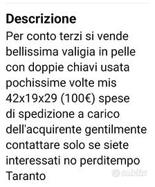 per conto terzi si vende bellissima valigia in pelle ( porta documenti) con doppie chiavi ottime condizioni usata pochissime volte 50€ spese di spedizione da concordare gentilmente contattare solo se siete interessati no perditempo Taranto