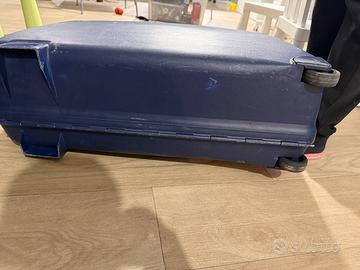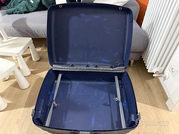 valigia blu scuro rigida trolley con due ruote e combinazione.