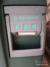 valigia da viaggio grande di colore verde, robusta e spaziosa, marca Samsonite dotata di ruote di plastica dura rigida vintage come da foto.