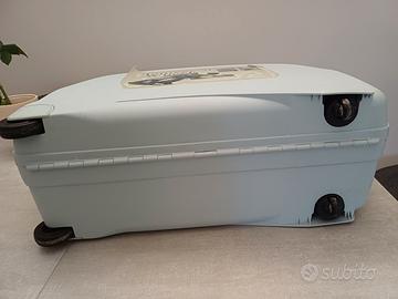 Valigia Shadow - grande - vintage - rigida - quattro ruote di cui due rotanti - maniglia allungabile - con combinazione e chiave - portabiti + tasche interne - colore turchese - dimensioni 65x50x25 cm circa. Ottime condizioni