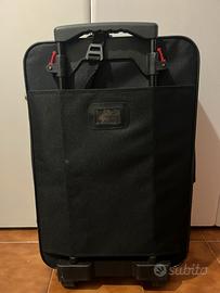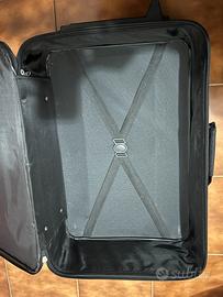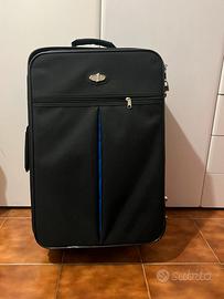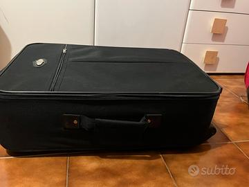 valigia trolley nera a cui manca un piedino e di conseguenza non sta in piedi da sola. 64×17×40 circa tasca interna presente