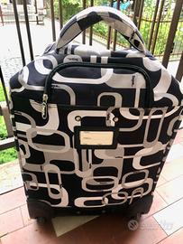Valigia trolley bagaglio a mano. Capiente e robusta. Scocca protettiva in tessuto, impermeabile e antigraffio. Interno completamente foderato con divisorio, imballaggio con cinghie e scomparti interni con chiusure zip per tenere gli oggetti al loro posto. Cerniere solide e resistenti, manico telescopico in alluminio per effettuare le manovre in tutta comodita, maniglie corte saldamente fissate e chiusura di sicurezza zip. 2 ruote per manovrabilita e maniglia a scomparsa. Usata poche volte. Misure altezza : cm 50; larghezza: cm 38; lo spessore dipende da quanto viene riempita