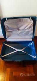 Trolley Roncato blu avio semirigida con codice di sicurezza cambiabile e due chiavette in dotazione. Misure circa 70 x50x30 escluse ruote