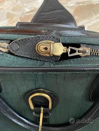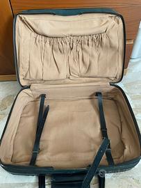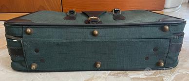 Valigia ricoperta da resistente stoffa verde con rinforzi agli angoli di colore nero.