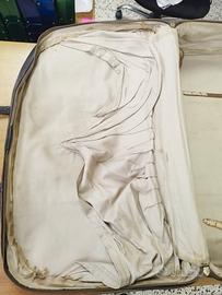 Valigia vintage anni '50 in ottime condizioni. In tessuto damasco e pelle. Oggetto unico per amanti del vintage e dei viaggi.