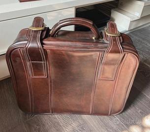 Cm 48x38x14. Molto bella. Svendo perché ha una delle cinghie interne da riparare (ma si può tranquillamente usare anche senza) e perché la fodera interna è un po’ ingiallita ai lati, come si può vedere nell’ultima foto. Non ho la chiave ma si chiude a scatto e con le due fibie laterali perfettamente conservate.