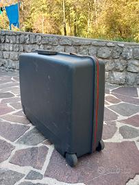 valigia Delsey modello “Club De Luxe” in plastica rigida del 1991, made in France; chiusura a 3 punti di cui quella a centrale a serratura con combinazione numerica, quelle laterali a chiavi; dotata di maniglia centrale per il sollevamento e di maniglia di traino retraibile; presenza di tasche interne e piano separatore fisso munito di tasca con chiusura lampo. Strutturalmente perfetta e molto robusta, esternamente presenta dei lievi graffi sui lati, interni pari al nuovo. In dotazione coppia di chiavi per la chiusura delle serrature laterali. Dimensioni: 65 x 50 x 22