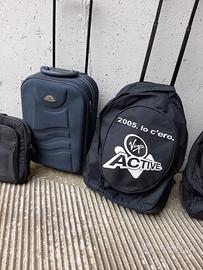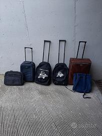 valigie a pochi euro. trolley piccolo blu chiaro 3 euro ,trolley grande marrone 5 euro, trolley blu grande 5 euro, valigia nera con ruote 4 euro , borse nuove a 3 euro, zaini a 2 euro, trolley virgin 2 euro