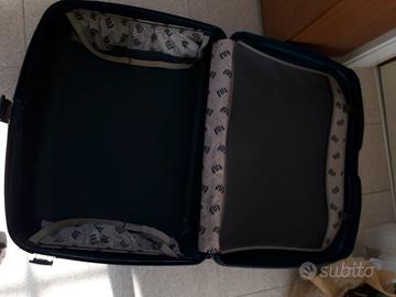 2 valigie di plastica rigida Samsonite misure 55x67cm e 63x74cm colore verde scuro usate. Sono dotate di maniglia, di 2 ruote e di una piccola maniglia laterale a scomparsa. Hanno una chiusura con combinazione funzionante e due ulteriori chiusure laterali. Accessoriate all'interno con scomparti come da foto. Rigate ma integre.