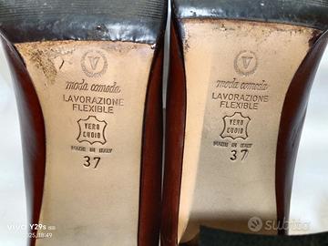 Eleganti décolleté Valleverde in pelle marrone, un classico intramontabile. Scarpe vintage da donna in ottime condizioni marca Valleverde moda comoda Made in Italy taglia 37 non è più presente la scatola. Tomaia in pelle marrone e rara fibbia con logo Valleverde dorato sul davanti. Dettaglio Lavorazione Flexible sulla soletta interna., punta tonda, suola in vero cuoio.