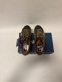Sneakers dal look vintage con effetto vissuto sulla suola, tomaia con texture artistica multicolor nei toni del marrone e dettagli in pelle scura su punta e tallone. Presentano applicazioni pins decorative laterali che rendono il modello unico e super originale