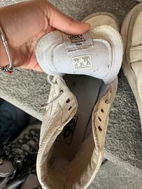 Vendo scarpe Vans Old Skool alte, bianche, numero 39. Sono in pelle bianca, leggermente usurate ma in buone condizioni.