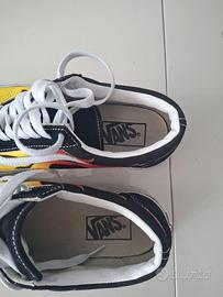 Vendo Vans Old Skool Flame originali, modello iconico con grafica a fiamme rosse e gialle.