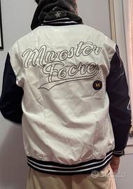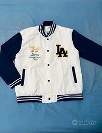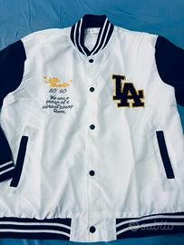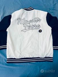 Vendo varsity jacket bianca e blu, perfetta per un look casual e streetwear. Giacca modello college con chiusura a bottoni, ricami decorativi e tasche laterali.