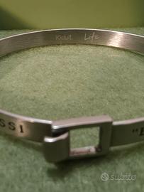 Si tratta di un bangle rigido in acciaio satinato che riporta un'incisione smaltata con una celebre frase di Vasco Rossi: "Eh già, sembrava la fine del mondo, ma sono ancora qua...".