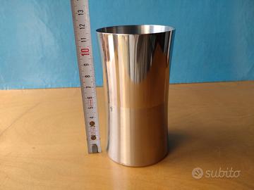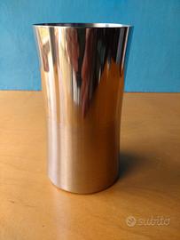 Vasetto in acciaio a forma diabolo, con finitura sia spazzolata che lucida, in ottime condizioni. Presenta solo una lieve ammaccatura su un punto del bordo inferiore come visibile in foto. Misure di riferimento in foto. Le foto descrivono esattamente il prodotto e sono parte integrante della descrizione. Visita il mio profilo per altri vasi in acciaio ed altri materiali non solo metallici.