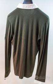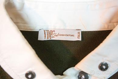 Camicetta maglietta VDP Club Gym Couture Italia verde Maglietta a maniche lunghe VDP Club con dettagli unici. Elegante, sportiva, per ginnastica a maniche lunghe, con colletto tipo camicia e risvolti bianchi sulle maniche. Colore verde bosco marrone scuro. In ottimo stato. 94% viscosa e 6% elastane. Misure: spalle 40 cm, maniche 64, ascelle 42, vita 39, fianchi 42, lunghezza 64 cm - Colletto bianco. - Patch decorativa sul petto. - Dettagli a righe sulla chiusura. - Patch con insegne sulla manica. - Polsini bianchi a vista. Taglia ITA 46 (vedi le misure) Colore Verde e Bianco