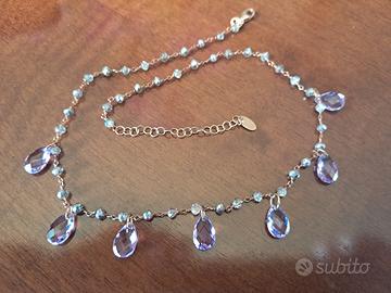 Collana in argento 925 placcata in oro rosa con sette cristalli pendenti color glicine/lilla ed altri piccolissimi bianchi, manufatto artigianale delle celebri argenterie Venerio di Vicenza attive dal 1965, specializzate in gioielli di qualità superiore. Lunghezza regolabile da 36 a 41 cm, il peso di grammi 6,5 (indicato solo per completezza di informazioni visto che comunque comprende sia argento che cristalli) Ho provato sfondi e luci diverse ma le foto non rendono giustizia ai bei colori e mille bagliori prodotti dai cristalli sfaccettati, un gioiello estremamente raffinato e squisitamente femminile NUOVO, mai indossato, spedisco nella scatolina nera originale visibile in foto! Si tratta di un regalo pagato quasi 100 euro (mi spiace non avere tenuto lo scontrino a documentazione) e poi non potuto consegnare.