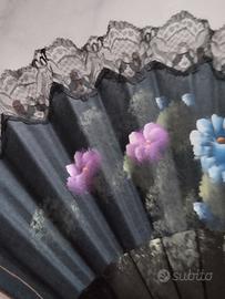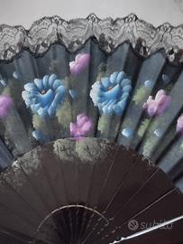 elegante ventaglio nero con pizzo motivo floreale, apertura massima 45x23. vintage anni 80