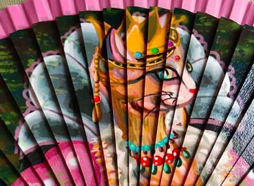 Ventaglio spagnolo in legno e tessuto dipinto a mano - dimensioni 40x20 cm. ca. - Oggetto unico con colori vivacissimi e soggetto originale (gattina vestita da damina del '600).
