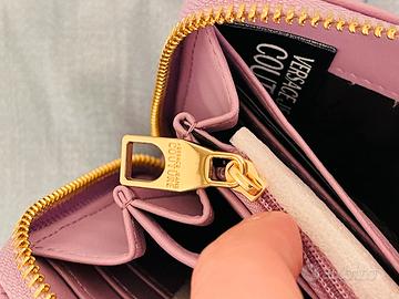 BORSA A MANO A TASCA POCHETTE HAND BAG IN SIMIL PELLE sintetica leggermente martellata VIOLA LIGHT con MANICOTTO CORTO in Eco PELLE su CURSORE loggiato e LOGO FRONTALE INCISO IN METALLO DORATO BAROQUE RICAMATO Design by Versace