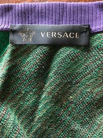 Cardigan lungo Versace in maglia di mix di cotone stampata animalier nei toni del viola, verde, nero e khaki.