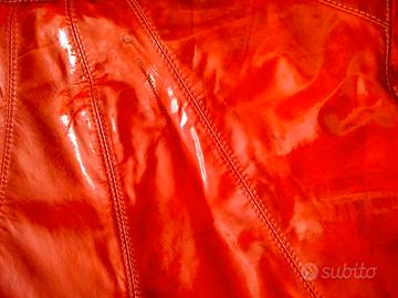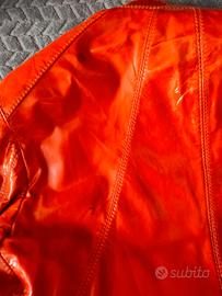 Giacca Versace arancione in vera pelle lucida tg. 44. Fodera in cupro. E' stata usata veramente poco, però ha sul retro segni visibili nella quinta e sesta foto. Svendo per questo motivo.