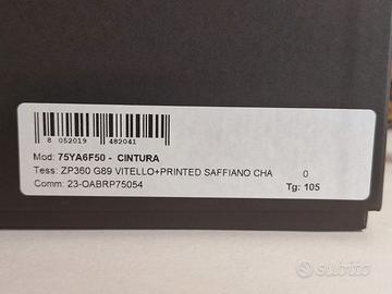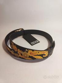 Cintura elegante Versace Jeans Couture con la caratteristica fibbia a placca con logo oro, 100% in pelle stampata con il motivo in stile barocco in nero e oro.