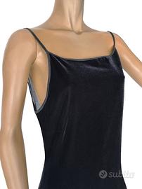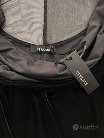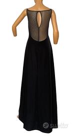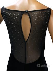 Abito da sera di Versace realizzato in velluto color nero. Particolare l’effetto magico presente sulle spalle conferito da un velo ricoperto di applicazioni in Swarovski distribuite in modo radiale e a distanza progressivamente maggiore. Vestibilità comoda e scollatura ampia ma non profonda, quasi a barca e con bretelline. Mentre la schiena per quanto esposta risulta coperta dal velo e i suoi Swarovski. Ogni abito per quanto ben conservato in armadio è previamente la vendita igienizzato.