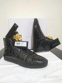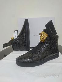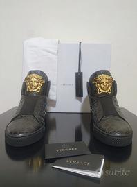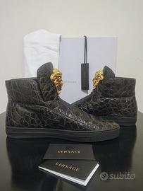 Sneakers di Versace in vera pelle di vitello nera lucida, con stampa coccodrillo e applicazioni in metallo dorato di Medusa sulle linguette. Interno in vera pelle nera.