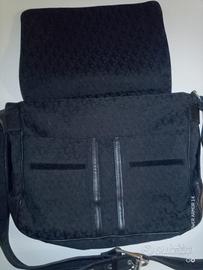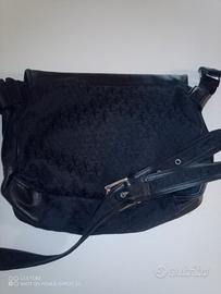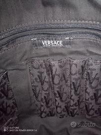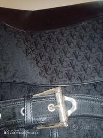 Borsa a tracolla Versace Jeans Couture originale di fine anni 90, ideale come porta PC/ documenti. In pelle e tessuto stampato con logo, cintura in pelle con grande fibbia.