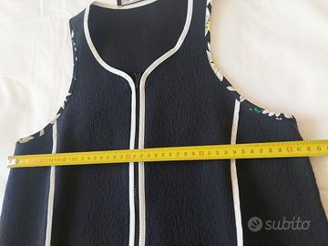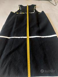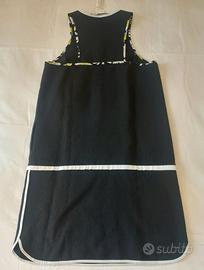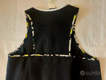 Abito Sportmax Code nero e fantasia senza maniche, tipo tubino con un particolare taglio sul retro. Vestibilita' morbida. Zip frontale per indossarlo, linee lunghe orizzontali che sottolineano la figura e motivo orizzontale fondo fianchi. Ha le tasche laterali a taglio ma non si notano. Piccola pietra luminosa su una delle spalle. Il tessuto nero, 100% cotone, è molto bello ed ha una fantasia tinta su tinta particolare a forma di fiori. Si indossa con un reggiseno a fascia. Allegate le foto con tutte le misure. Vedi foto etichetta per la taglia Small. Posso inviarne altre su richiesta.