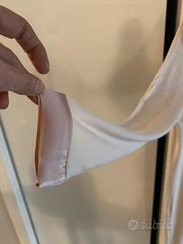 Colore: cremacon finiture in rosa cipria satinato •Materiale: tessuto morbido e fluido ,viscosa,con inserti lucidi raso •lo scollo a V •la chiusura frontale •Taglio: lungo e dritto, cade morbido sul corpo (stile rilassato e comodo) •Maniche: lunghe •Chiusura: bottoni frontali rivestiti, coordinati con il bordo satinato