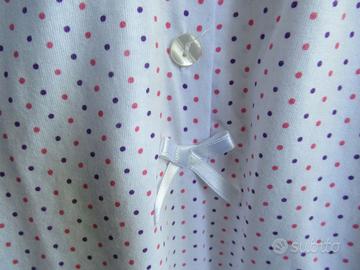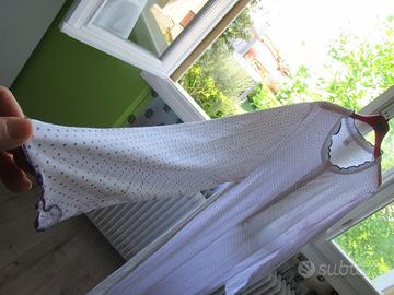 Vestaglia donna puro cotone praticamente nuova, bianca a pois con rifiniture viola, taglia M di vestibilità ampia, vendo a 8 euro. Invio misure su richiesta.