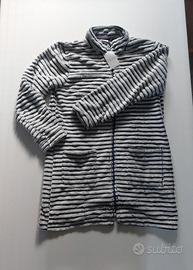 🔸️Design: Fantasia a righe orizzontali bianche e blu/grigio scuro. Apertura frontale con zip integrale, collo alto e due comode tasche frontali.