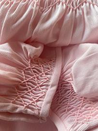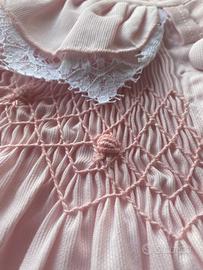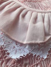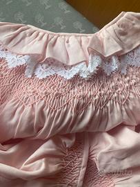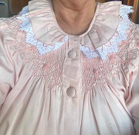 Vestaglia lunga in picché rosa lavorata nella parte superiore in nido d’ape .. arricchica con pizzo . Ricami fiorentini