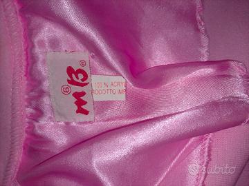 Vestaglia in acrilico di color rosa, nuova, scollo a scialle, ricamo e ruches nello scollo, tasca anteriore applicata, cintura in tessuto, taglia 6.