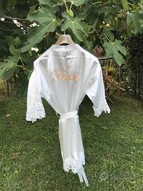 Vendo vestaglia da sposa bianca, elegante e leggera, con scritta 'Bride' in oro sulla schiena. Taglia unica, adatta per shooting pre-matrimonio, preparativi o addio al nubilato. In ottime condizioni, indossata una sola volta per lo shooting pre-matrimonio.