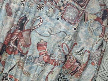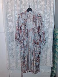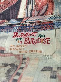 Vestaglia Unisex a manica lunga, modello aperto davanti con cintura da legare alla vita, in 100% Cotone. Tessuto morbidissimo e di facile lavaggio in lavatrice. Taglia Unica, molto versatile. Con 2 ampie tasche laterali. Originale dalle Hawaii, prodotta dal Marchio BareFoot In Paradise (Hawaii). Fantasia molto particolare con disegni di motivi di antica caccia equestre (corni da caccia e selle) a colori celeste, rosso mattone, crema, nero e bianco. Articolo nuovo, perfetto, nessun difetto, mai utilizzato.